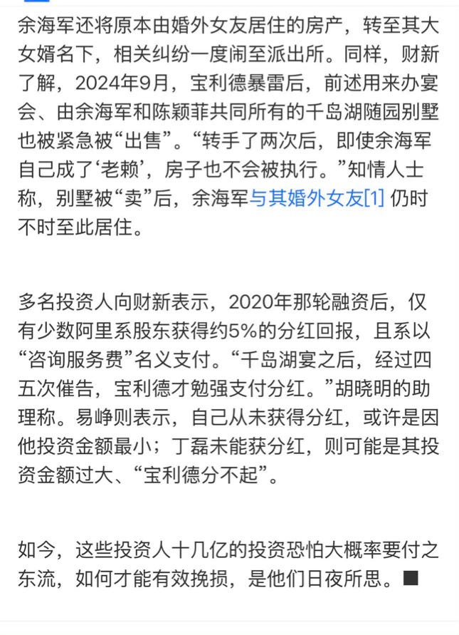 1月23日,财新发布报道《豪车、夜宴与谎言 宝利德阴阳账本套牢浙商老钱新贵》,这篇调查报导聚焦宝利德控股集团的破产迷局、余海军的融资模式与投资人损失,标题中的“夜宴”指2022年7月24日杭州千岛湖随园小区的夜宴作为故事开端,后文末提及2024年9月暴雷之后,当年夜宴的别墅虽然被转手,但余海军与“婚外女友”依然时不时住在这里。随后,网民指出,这场夜宴正是余海军、金刻羽为其孩子举行的满月宴,余海军的“婚外女友”不是别人,正是这位世界著名的经济学教授金刻羽。