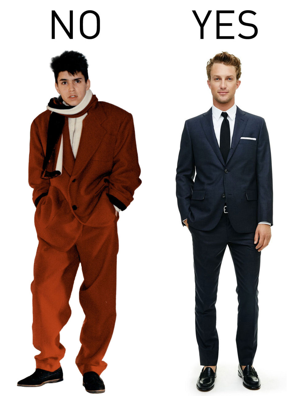 现在都什么年代了,竟然还有人会穿像是图左这样的宽松西装look。仿佛参加高中毕业舞会临时找不到适合的西装,而去租套便宜的搪塞一样。男人们!在西装的选择上一定要特别小心注意,合身的笔挺剪裁才是王道。