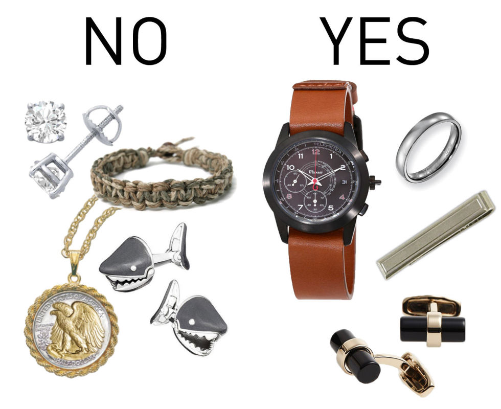 看着上图相信不用解释太多,女人们也会选择和佩戴右图配饰的那位约会吧。丢掉那些让自己显得不成熟的“小朋友配件”吧!看起来真的很廉价,而且一点都不时尚。