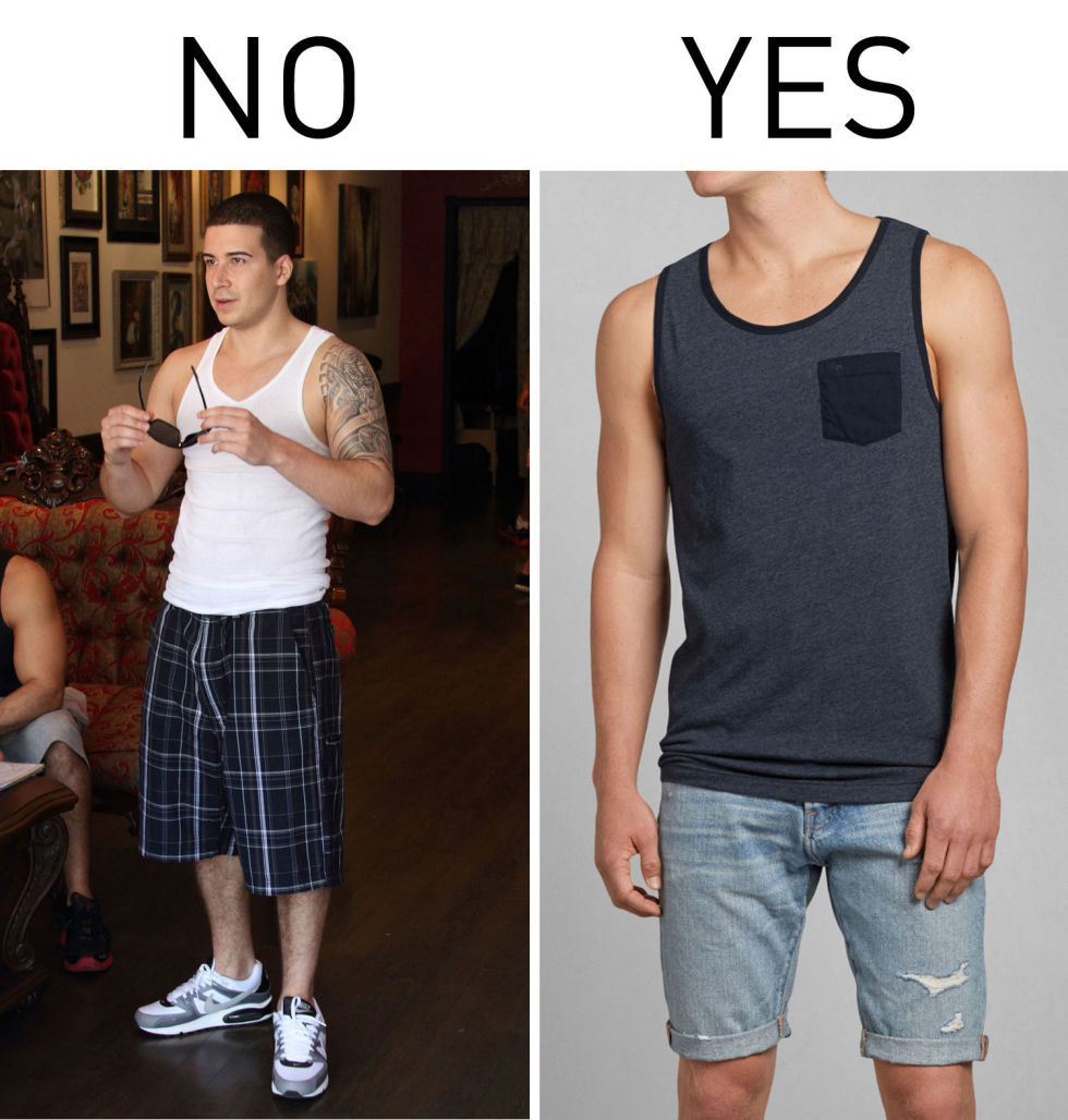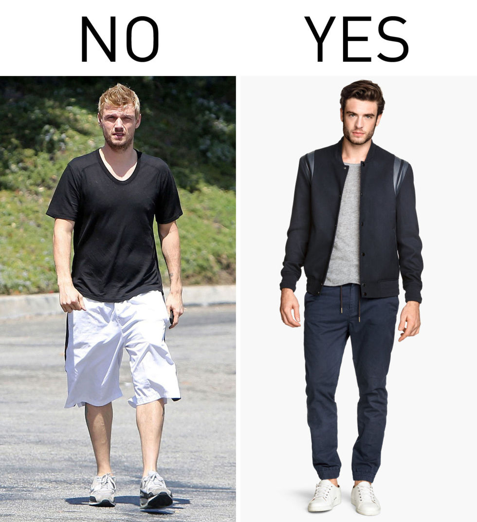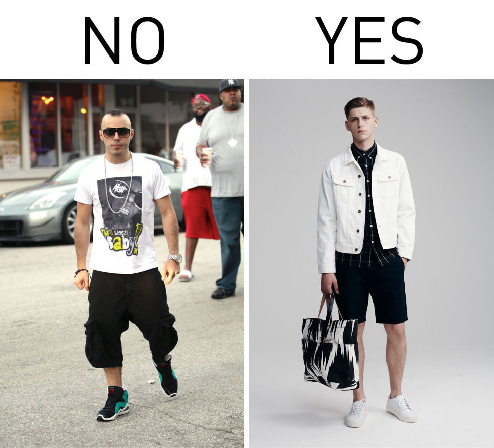 图左穿搭法是否让你觉得“倍感亲切”?是的!路上随便抓至少十个有八个男人都是这样穿的(特别是在加州)。这样不是不好,只是无论健身、约会还是出游都这样穿,不觉得有点稍嫌无趣吗?