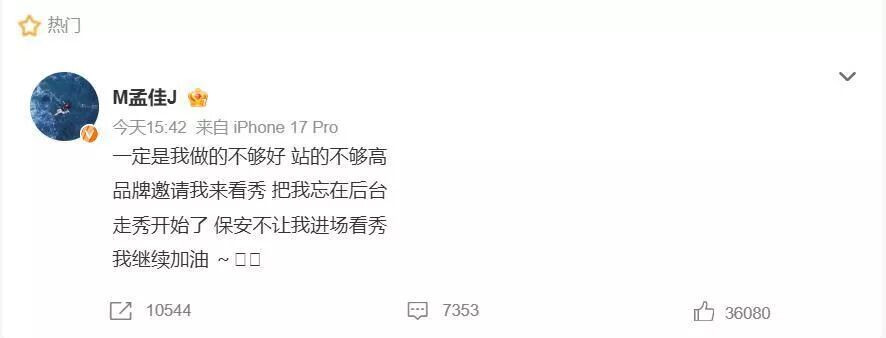 孟佳发文:一定是我做的不够好,站的不够高,品牌邀请我来看秀,把我忘在后台,走秀开始了,保安不让我进场看秀,我继续加油~