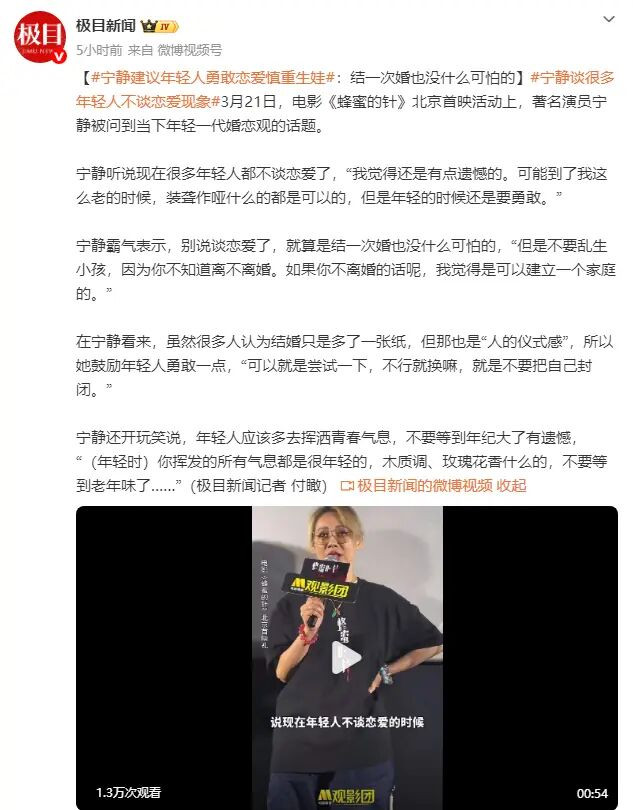 3月21日,电影《蜂蜜的针》北京首映活动上,著名演员宁静被问到当下年轻一代婚恋观的话题。